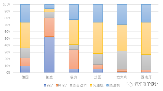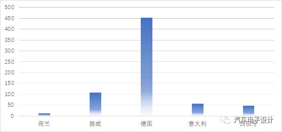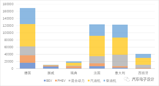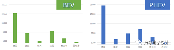 從新能源汽車的角度來看,德國、挪威、瑞典、法國和意大利的新能源汽車的銷售數(shù)量分別為36,903、8,309、6,893、14,654、6,254,西班牙稍少一些為1595臺。這個數(shù)據(jù)在去年年末沖量的基礎(chǔ)上開始回落,但是也是一個比較高的水平。