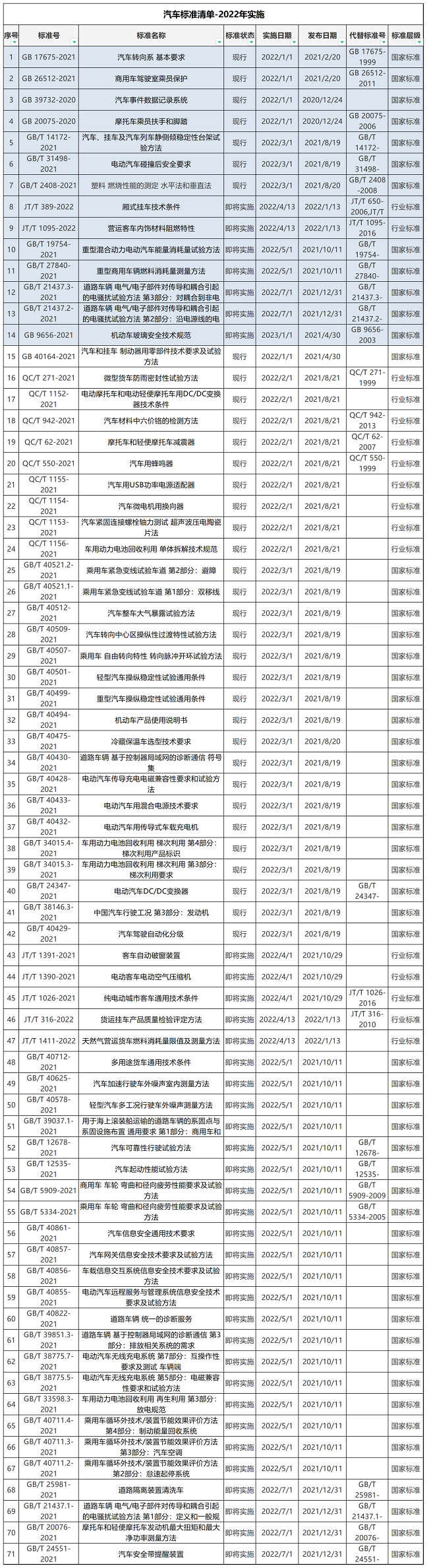 自2022年1月1日起,14項(xiàng)強(qiáng)檢汽車標(biāo)準(zhǔn)和57項(xiàng)非強(qiáng)檢汽車標(biāo)準(zhǔn)開始實(shí)施?,F(xiàn)對2022年1月1日起正式實(shí)施的汽車標(biāo)準(zhǔn)進(jìn)行了整理匯編,供大家參考。