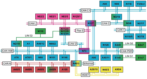 CAN A。車載智能信息系統(tǒng) (CAN);CAN C. 發(fā)動機(jī)控制器區(qū)域網(wǎng)絡(luò) (CAN);CAN C1. 傳動系統(tǒng)控制器區(qū)域網(wǎng)絡(luò) (CAN);CAN D. 診斷控制器區(qū)域網(wǎng)絡(luò)(CAN);CAN HMI. 用戶界面控制器區(qū)域網(wǎng)絡(luò) (CAN);CAN I. 傳動系傳感器控制器區(qū)域網(wǎng)絡(luò) (CAN);CAN L. 混合動力控制器區(qū)域網(wǎng)絡(luò) (CAN);CAN PER. 外圍設(shè)備控制器區(qū)域網(wǎng)絡(luò) (CAN);Ethernet. 以太網(wǎng);Flex E. 底盤 FlexRay;LIN E2. 座椅承載識別區(qū)域互聯(lián)網(wǎng) (LIN);LIN G1. 左側(cè)大燈局域互聯(lián)網(wǎng) (LIN);G2. 右側(cè)大燈局域互聯(lián)網(wǎng) (LIN);MOST. 多媒體傳輸系統(tǒng)。2. 車際網(wǎng)絡(luò)