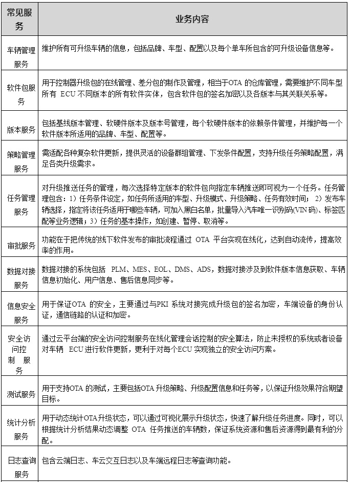 (4)業(yè)務(wù)服務(wù)層:業(yè)務(wù)服務(wù)層是 OTA 服務(wù)所有業(yè)務(wù)及相關(guān)流程管理功能在云平臺(tái)端的實(shí)現(xiàn), 除了車輛管理服務(wù)、軟件包服務(wù)、版本服務(wù)、策略管理和任務(wù)管理 5 個(gè)支撐 OTA 的核心功能外,還包括關(guān)聯(lián)系統(tǒng)審批、數(shù)據(jù)對(duì)接、信息安全服務(wù)、測(cè)試、統(tǒng)計(jì)分析、日志查詢等重要輔助功能。由于不同的企業(yè)內(nèi)部管理存在差異,云平臺(tái)所支持的輔助業(yè)務(wù)可能存在較大差異,常見(jiàn)服務(wù)列舉見(jiàn)表 2-4。